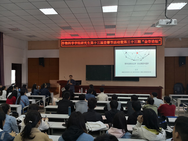 4月11日,作物科学学院在生物楼501举办了以“扬起梦想之帆,开拓创业之路”为主题的“金谷论坛”活动。本次活动由学院2018届优秀毕业生凌誉同学主讲,研究生辅导员卢艺彬、研会有关负责人以及广大研究生参与。