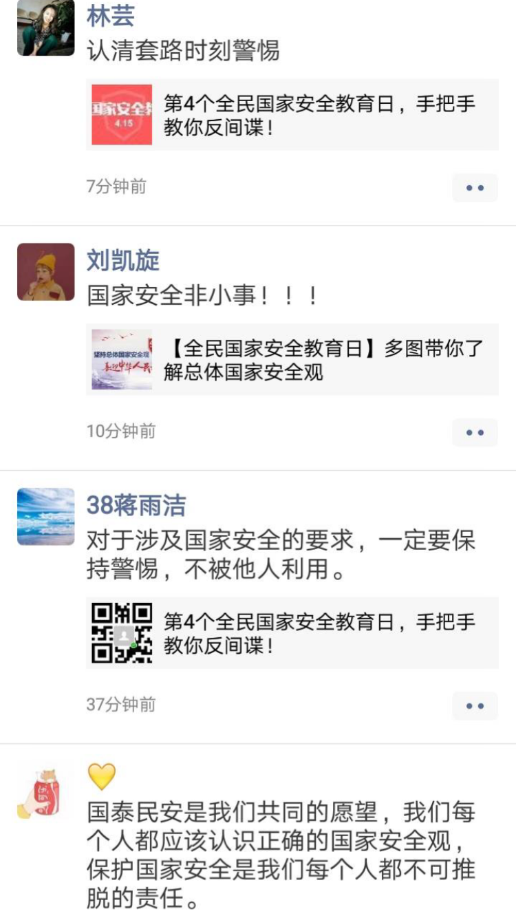 今年的4月15日是第4个全民国家安全教育日。为了让同学们进一步了解国家安全基本知识、树立正确的国家安全观、提高自觉维护国家安全的责任感,动物科学学院团委以团支部为单位、结合新媒体开展教育宣传活动。微信学习截图此次活动主要以微信为主要阵地,图文并茂的微信课堂介绍了总体国家安全观的具体内容和如何甄别间谍、反间谍的小知识;结合真实的间谍案件,呼吁同学们提高警惕,时刻防范间谍入侵。同学们在学习相关知识后,纷纷在评论中表示,维护国家安全是大学生义不容辞的责任。