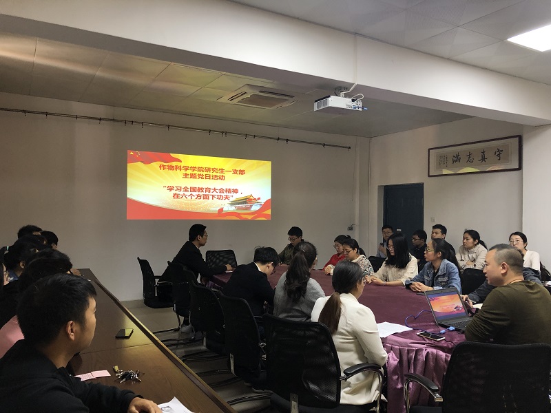 4月17日上午,作物科学学院研究生一支部召开入党积极分子述责答辩会暨“学习全国教育大会精神,在六个方面下功夫”主题党日活动。会议由支部书记吴家铭主持,支部全体党员参加。