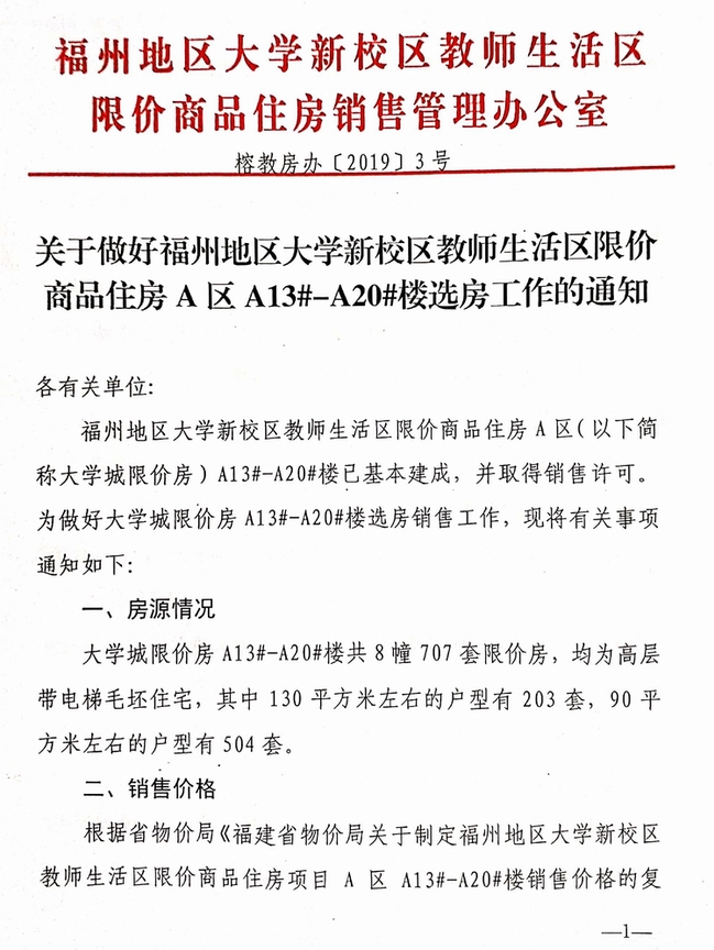 福州地区大学新校区教师生活区限价商品住房A区A13#—A20#楼已基本建成,并取得销售许可,现根据《关于福州地区大学新校区教师生活区限价商品住房A区A13#-20#选房工作通知》(榕教房办[2019]3号)有关内容,提取文件中关于选房的几点特别重要的事项提示如下,请各选房人注意: