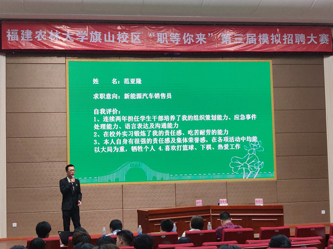 5月16日晚,旗山校区第三届“职等你来”模拟招聘大赛决赛在小报告厅举行。本次比赛由福建某地产集团人力资源中心人资经理卢学成,福州珍源康制药有限公司销售总监左利营,福建好搜信息技术有限公司福州区销售经理王明英,国家二级职业指导师方万春担任评委。校区两个学院近两百名学生观看了比赛。