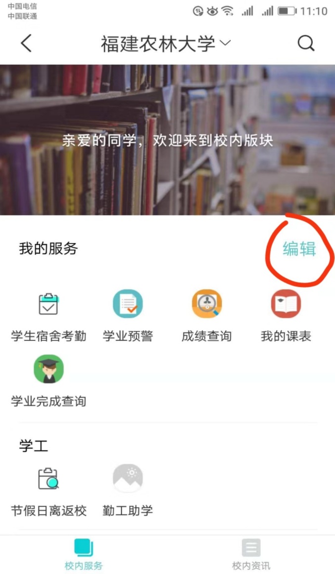 今日校园自定义我的服务:登录成功后学生“我的大学”进入校内服务,教职工则直接点下方的“服务”进入,可以看到所有授权的服务,师生可根据自己需要将常用的服务加到“我的服务”中,靠上方显示。