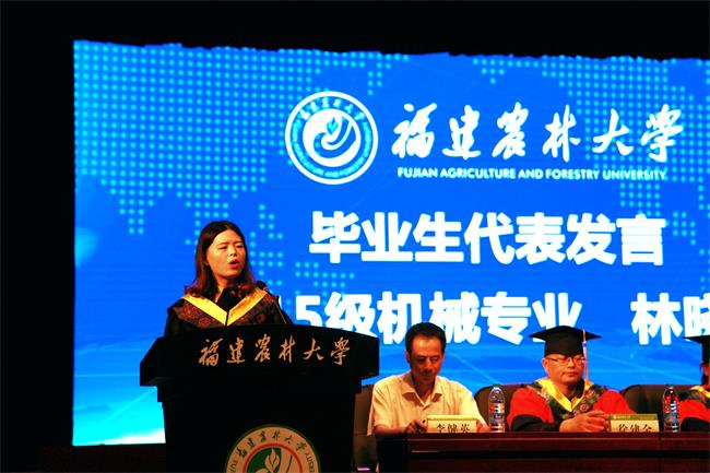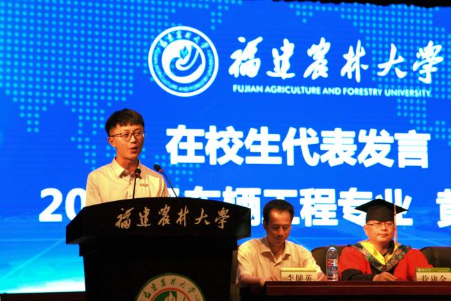 2015级机械设计制造及其自动化专业林晓婷、2016级车辆工程专业黄镇城两位同学分别作为毕业生代表与在校生代表发言,表达了毕业生们对学院及老师的感激之情、对同学们的不舍之情、即将踏入社会的坚定信心和在校同学对学长学姐们的美好祝愿。