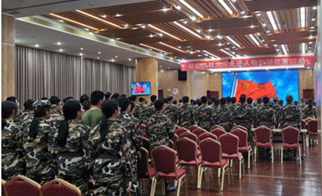 观看先进人物视频前,学院组织2019级全体新生齐唱国歌。现场,全体师生观看了由校党委宣传部制作的先进人物引领教育活动视频,包括“纵死终令汗竹香”的林俊德、“巍巍太行树丰碑”的李保国、“用生命之门叩开地球之门海归教授”的黄大年、“政声人去后百姓记心头”的廖俊波、“爱是教育的灵魂”的曲建武、“用生命诠释初心和使命”的黄文秀等几位先进人物事迹。