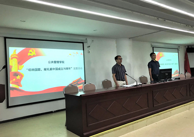 9月19日,公共管理学院在公管楼201教室开展“唱响国歌,献礼新中国成立70周年”活动,学院党委副书记陈建辉,辅导员林锋、黄吉迎以及各班级团支书参加活动。