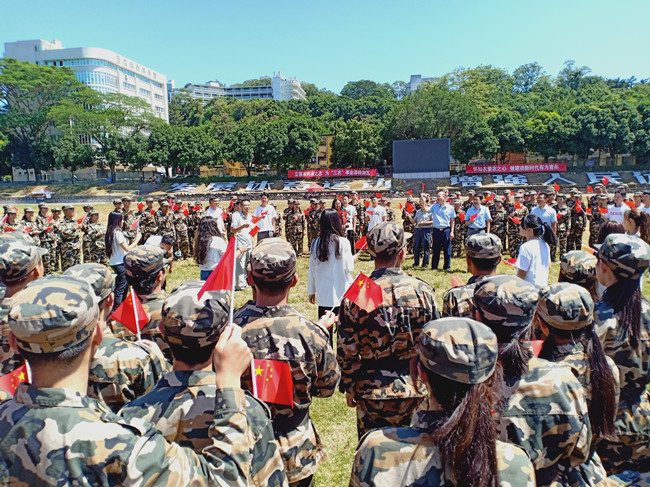 活动伊始,全体师生代表面向国旗行注目礼,一同唱响《国歌》;随后,田径场上响起悠扬的小提琴声,《我和我的祖国》缓缓奏响,学院领导、教师代表及老生代表高举国旗、发自内心的唱着动人的旋律,缓缓从新生方阵走出,身着军训服装的新生围成一圈,共同挥舞着手里的五星红旗,一同演绎完成了《我和我的祖国》和《我的中国心》两首歌曲。参加本次活动的19级新生杜世杰说到:“今天的快闪活动很精彩,形式也是我们所喜爱的,既唱出了热血豪迈,也唱出了我们对祖国未来的期盼和畅想!通过这样的活动,强化了我们对国歌等爱国歌曲精神内涵的认识,很有必要。”