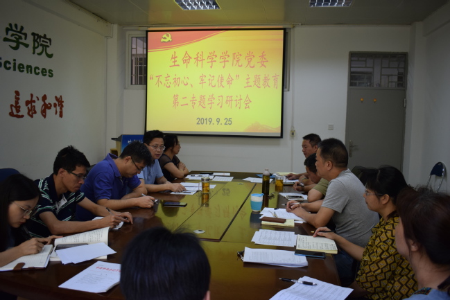 9月25日上午,生命科学学院党委在生科楼404室开展“不忘初心、牢记使命”主题教育第二专题集中学习研讨。与会人员围绕“坚定理想信念”这一主题进行研讨交流,院党委书记林豪森主持会议并带头发言。中心组成员、科级干部和党支部书记参加会议。