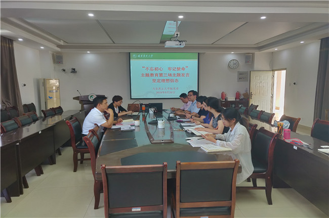 9月26日下午,在明德楼613室,马克思主义学院党委开展了“不忘初心,牢记使命”第三专题集中学习研讨会,围绕“坚定理想信念”主题集中学习研讨。院党委书记连文主持,院长刘新玲作重点发言。