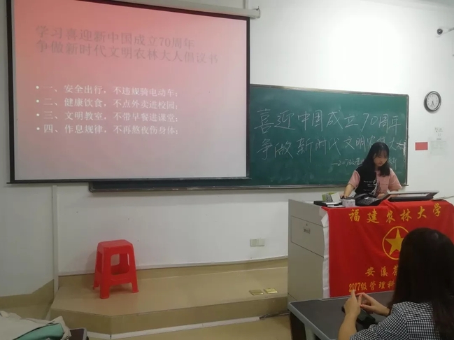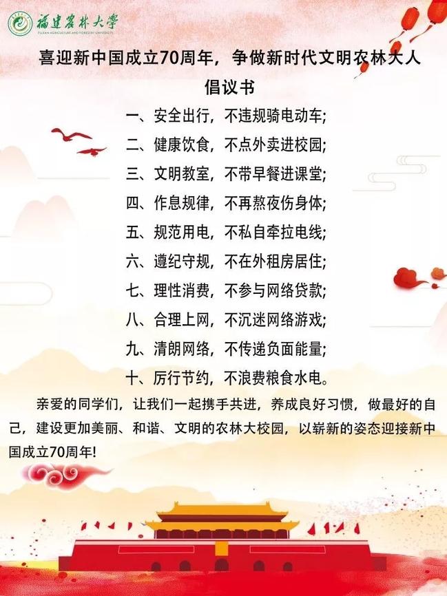 近日,安溪校区·安溪茶学院各团支部积极组织开展学习践行“喜迎新中国成立70周年,争做新时代文明农林大人”倡议书活动。倡议书2017级管理科学团支部开展团日活动现场2017级商务经济学(1)班团支部开展团日活动合影各团支部以多样化的形式开展团日活动学习十个“不”倡议,在日常生活中践行十个“不”倡议,一起构建一个文明、和谐的美好校园,以崭新的面貌向祖国致敬,以更好的姿态迎接新中国成立70周年!