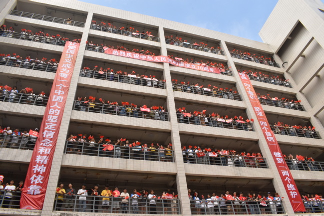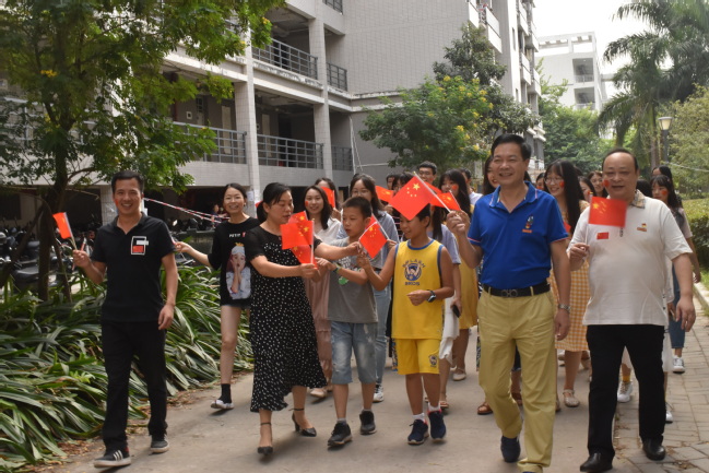 为庆祝中华人民共和国成立70周年,9月28日下午,艺术园林学院在学生宿舍区桃山8号楼举办“我和我的祖国”主题党日活动暨庆祝中华人民共和国成立70周年快闪活动,学院党委书记陈为德、副书记曹伟及全体党员、师生代表约1000余人参与本次活动。