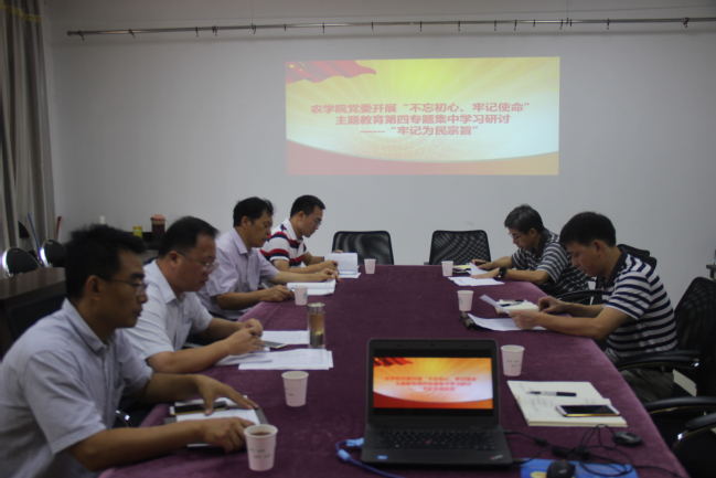 10月8日上午,农学院党委在学院三楼小会议室开展“不忘初心、牢记使命”主题教育第四专题集中学习研讨,农学院党政班子成员、党委委员、教工党支部书记围绕“牢记为民宗旨”这一主题进行研讨交流。
