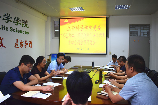 10月8日上午,生命科学学院党委在生科楼404开展“不忘初心、牢记使命”主题教育第四专题集中学习研讨。与会人员围绕“牢记为民宗旨”这一主题进行研讨交流,院党委书记林豪森主持会议,院党委委员、副院长许卫锋作重点发言。中心组成员、科级干部和党支部书记参加会议。