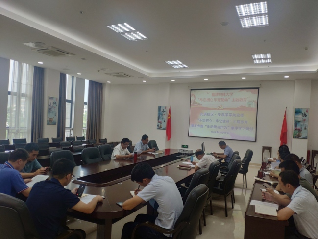 10月9日,安溪校区·安溪茶学院党委召开党委理论中心组扩大会议,开展“不忘初心、牢记使命”主题教育第五专题集中学习研讨,围绕“主动担当作为”这一主题进行学习研讨交流。党委书记雷国铨主持会议,安溪校区管委会副主任、安溪茶学院副院长陈勇作重点发言,中心组成员、科级干部、党支部书记参会。