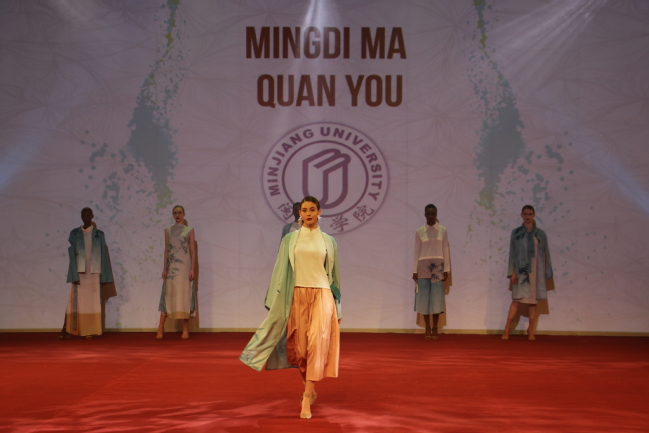 来自闽江学院的马铭笛和尤权两位学生在轻快的融合了现代元素的《茉莉花》音乐旋律中,为多彩德班带来了不一样的中国元素。青衫罗裙衬团扇,柔情侠骨似水如风,自东方而来的传统中国元素与现代服饰的碰撞,在“多彩德班”时装秀上大放异彩。