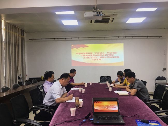 10月10日上午,农学院党委在学院三楼小会议室开展“不忘初心、牢记使命”主题教育第五专题集中学习研讨,农学院党政班子成员、党委委员、教工党支部书记围绕“主动担当作为,发扬斗争精神增强斗争本领”这一主题进行研讨交流。