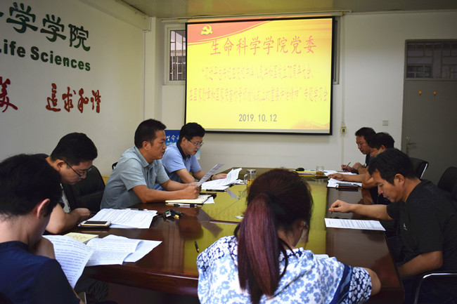 10月12日上午,生命科学学院党委在生科楼404室召开理论中心组学习会,专题学习贯彻习近平总书记在庆祝中华人民共和国成立70周年大会及在国家勋章和国家荣誉称号颁授仪式上的重要讲话精神。会议由院党委书记林豪森主持。