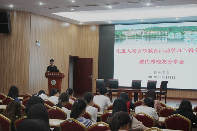 10月11日晚,国际学院在常盛会议中心举办先进人物引领教育活动学习心得分享会暨优秀校友事迹分享会。潘雪、高沈辉、傅旻昊、陈黄亦锌和马凯镇5位优秀校友,学院党委副书记叶扬捷、辅导员和2019级新生代表120余人参加了此次活动。分享会由2017级生态学中加班王云翰同学主持。