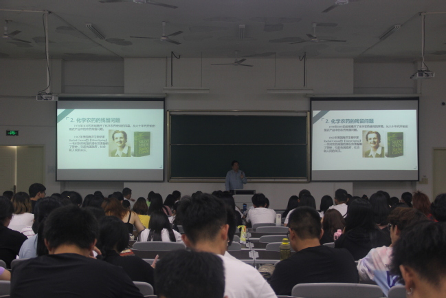 陈宗懋院士首先就当前中国茶产业可持续发展面临的问题做简要总结概括。他认为,问题主要在于四个方面:产能过剩、环境安全、质量安全以及出口与消费方面。随后,陈宗懋院士就茶叶质量安全及绿色防控两方面问题做了详细的阐述。针对质量安全问题,陈宗懋院士为同学们介绍了许多新名词、新概念,并细致的为同学们讲解了“MRLs标准”;在绿色防控部分,陈宗懋院士重点从防控的目的和措施两方面入手,对茶叶的绿色防控进行了仔细地说明。