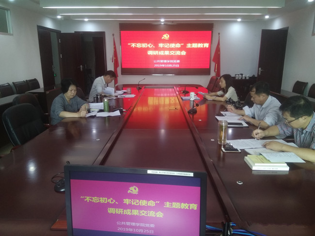 10月25日,公共管理学院党委开展“不忘初心、牢记使命”主题教育调研成果交流会,学院党委领导班子成员参加,学院党委书记曾起郁主持会议。
