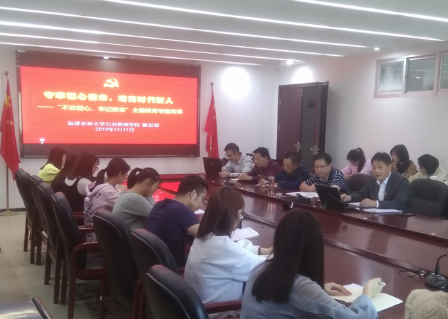 11月1日,公共管理学院党委书记曾起郁为师生党员讲“不忘初心、牢记使命”主题教育专题党课,其所联系的教工劳动与社会保障党支部、本科生第一党支部的党员、学院各党支部书记参加党课。
