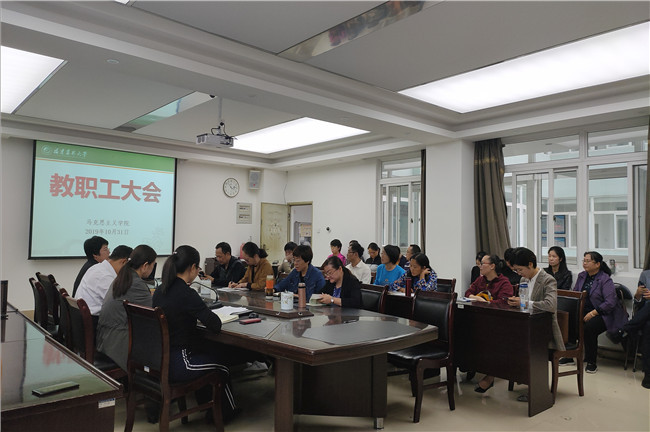 10月31日下午,马克思主义学院于明德楼613室召开全院教职工大会。会议布置了学习贯彻十九届四中全会精神高层论坛、十周年院庆、“讲好中国故事”等相关工作。院党委书记连文主持会议。