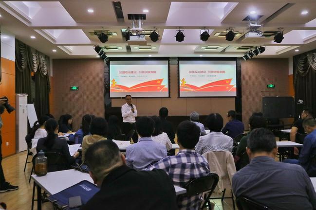 11月1日晚,在洋中科教基地,食品科学学院党委书记苏健涵为师生党员讲“加强政治建设,引领学院发展”主题教育专题党课,学院教工党员、全体党支部书记参加党课。