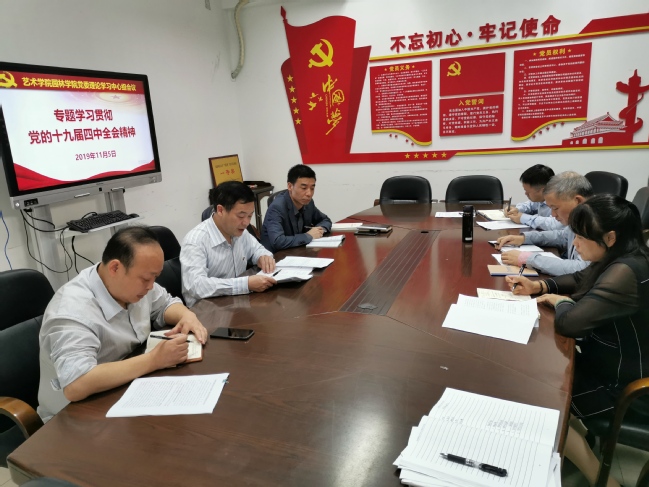 11月5日下午,艺术学院园林学院党委书记陈为德在综南附205-1室主持召开党委理论学习中心组会议,专题学习党的十九届四中全会精神,并对学院贯彻落实意见做出要求。院长张飞萍,院党委副书记曹伟,副院长陈祖建、陈小英、彭东辉等理论中心组成员出席会议。