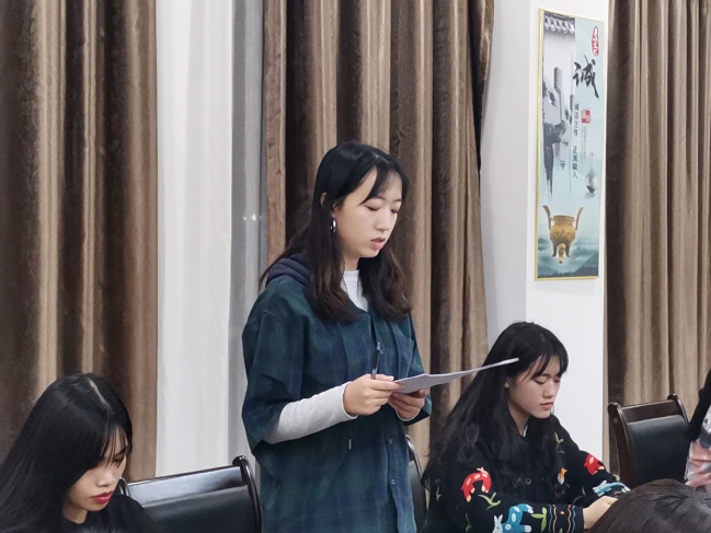 会上,王刚结合工作实际就学习贯彻党的十九届四中全会精神作了分享,学生代表施玉韩带领大家做“凝聚新力量·筑梦新时代”专题学习,重点介绍了党的十九届四中全会做出的关于坚持和完善中国特色社会主义制度、推进国家治理体系和治理能力现代化重要决定,明确了两个“青目标”,即要深入学习领会中国特色社会主义制度发展和我国国家治理的历史性成就,增强“四个意识”,坚定“四个自信”,坚决做到“两个维护”,砥砺爱国情怀,激发奋斗精神,团结引领广大同学充分发挥专业优势,不忘初心,牢记使命,锐意进取,开拓创新,凝聚新青年力量,筑梦新时代征程,为实现“两个一百年”奋斗目标、实现中华民族伟大复兴的中国梦而努力奋斗。两名学生代表结合学生工作做学习心得分享。