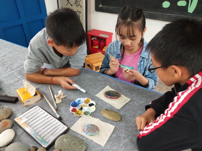 学生现场创作石头画