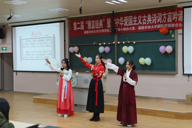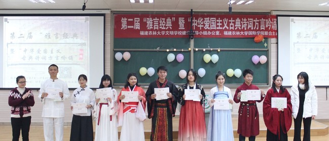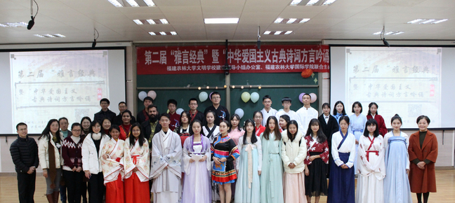 12月6日晚,由校文明办、国际学院联合主办,国学部承办的第二届“雅言经典”暨“中华爱国主义古典诗词方言吟诵”大赛决赛在禧强楼207举行。国学部张宁、李仁生、林文华、傅晓翎、陈然等五位专任教师担纲评委。