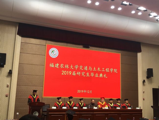 12月20日上午,交通与土木工程学院2019届研究生毕业典礼于旗山校区报告厅召开。院党委书记洪诚、院长廖飞宇、教授委员会委员们以及部分研究生导师、辅导员和2019届研究生毕业生及其家属、亲友等参加了本次毕业典礼。典礼由副院长胡喜生主持。
