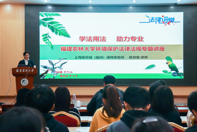 12月19日下午,资源与环境学院举办环境保护法律法规专题讲座,邀请了上海锦天城(福州)律师事务所陈慧敏律师主讲。学院党委书记陈月霄、副书记刘强、教师代表、校大学生环境保护协会及学院环境工程专业学生共230人参加讲座。讲座由刘强主持。