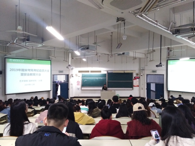 12月19日晚,艺术园林学院于创新楼102教室召开2017级本科生期末考风考纪大会暨安全教育大会,2017级全体学生到场参加。会议现场会上,辅导员要求全体同学要认真温习、诚信迎考,严肃考风考纪,严肃对待进行课程汇报的科目;强调全体学生干部、党员同学要努力学习,做好表率。针对安全问题,辅导员要求全体同学要做好期末及寒假期间的宿舍安全隐患排查工作,并就寒假返乡期间的交通安全、饮食安全和生命财产安全再次做了强调。辅导员还强调了做好大学生生涯规划的重要性。