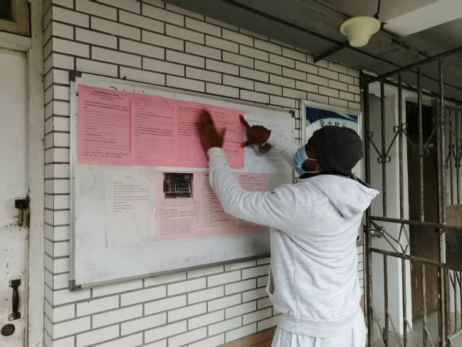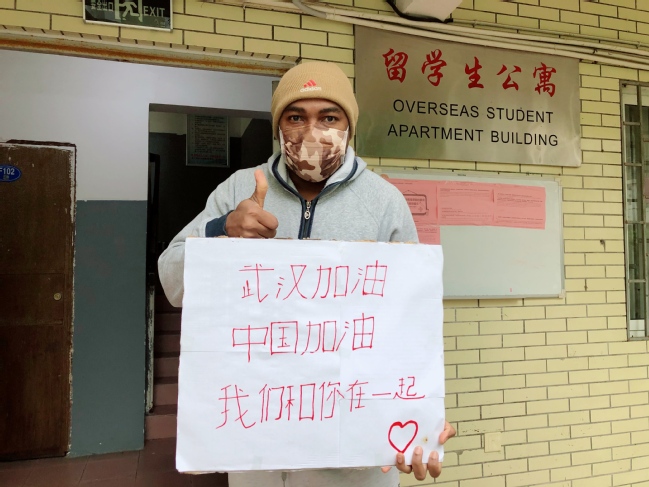 疫情期间,有130多位留学生留校,他们当中很多人都主动协助留管老师开展疫情防控,尼日利亚籍Chris Justice就是其中一位,他主动担当责任,发挥其留学生工作助手表率作用,深入留学生群体精准掌握学生去向,关注在校留学生的心理动态,协助做好留学生疫情期间心理压力、焦虑情绪地倾听与释放,协助做好口罩、体温计等防疫物资发放以及防疫宣传工作,不厌其烦的在各年级留学生群中提醒大家防疫期间政府和学校各项管理措施。Chris在朋友圈中发起为中国加油的行动,得到了许多留学生的响应转发,他写到:“让我们为这个国家祈祷,她给了我们安全的学习生活环境,她被我们称之为第二故乡。也让我们为正在遭受疫情的中国人民祈祷,希望所有人都平安,让所有遭受疾病折磨的人们和城市重新回归正常。”