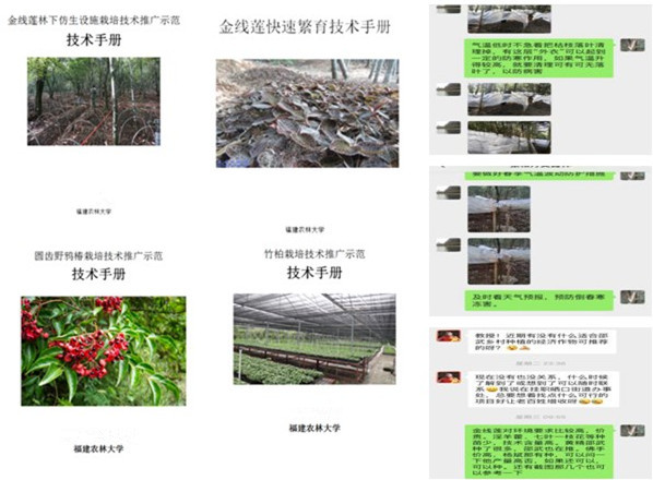 林下经济研究团队依靠团队中科技特派员特色优势,通过电话、短信、微信等指导基层合作基地、合作社、林农做好“保春耕、战疫情”。团队积极指导福建锦盛农业科技开发有限公司、三明市益晟农林有限公司、邵武市锦溪天成苗木有限公司、南安市向阳海山果林场、霞浦县强民油茶专业合作社、闽清县美菰育莲农业专业合作社、福建虎伯寮生物集团有限公司等,开展对圆齿野鸦椿新品种“美人含首”、“红宝石”,香樟新品种“南安1号”的种苗繁育,注意倒春寒对越冬金线莲生长的影响,并引导基地周边农户做好整地移苗备耕,争取春季造林,推动成果落地,助力乡村脱贫。抓紧编写林下经济开发相关技术手册,将群众急需的栽培技术、种植方案、病虫害防治方法等快速送到群众手中。借助微信、农信网等开展线上培训,指导群众有序复工,备好有机肥、复合肥等农用物资,做好种子及种苗仓储管护工作。利用团队中科技特派员工作群,及时与帮扶对象沟通,了解基层造林和种苗需求等困难,及时解决疫情时期积累的各项种植生产技术难点,指导帮扶对象抗疫与复工两不误。