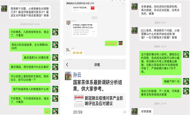 疫情防控时期,全省茶区也进入重要农事活动阶段,乡村振兴茶产业技术服务团队等形式通过电话、QQ、微信、电子邮件等形式,开展产业各领域的技术服务。团队先后为永春山门茶叶发展有限公司、大田茶企、政和云根茶业有限公司、福建江山美人茶业有限公司在线指导和咨询服务,指导企业注意倒春寒气候对春茶生产的影响,降低采茶人员密集度、有条件的多采用机械采茶等。对各产茶区积极宣传做好茶业应对疫情防控工作,帮助茶企积极应对疫情对当前复工复产带来的困难和问题。组织和参与有关茶叶指导专家、茶叶主产区技术骨干会商,综合研判各方面情势,提出我省春茶生产应对措施。