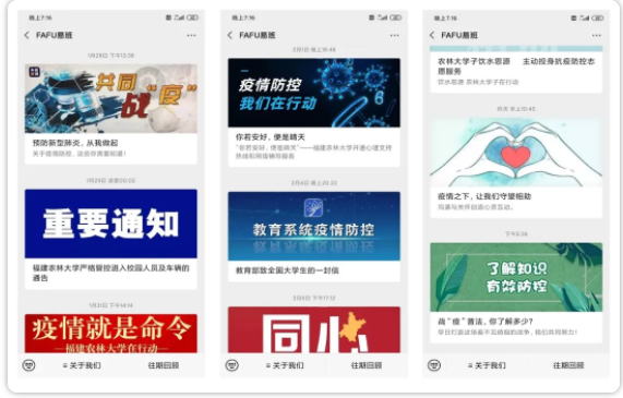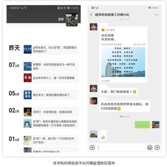 全校辅导员积极运用微信群、QQ群等渠道,将上级的有关精神、各项学校通知公告和各类科学防控知识及时传达给同学们,结合心理调节、学习安排、生命教育、爱国主义教育等内容积极撰写发布网络短文、温馨提醒等,为同学们答疑解惑,引导正确认识疫情,有力弘扬主旋律,传递正能量。