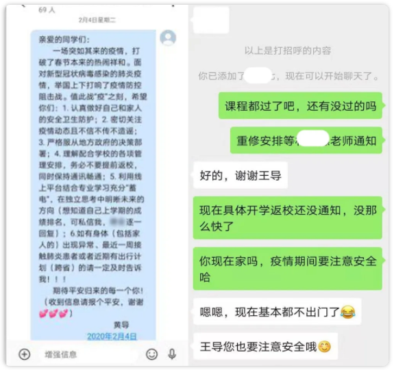 “请大家不要提前返校”“你若无恙,我便安好”“切记!不要出门!不要出门!”……朋友圈里全是辅导员不厌其烦的叮咛嘱咐,对辅导员而言,这个寒假师生之间相隔虽远,但是心与心却靠得特别近,暖暖的......他们坚信,寒冬总会离去,春天一定会到来!