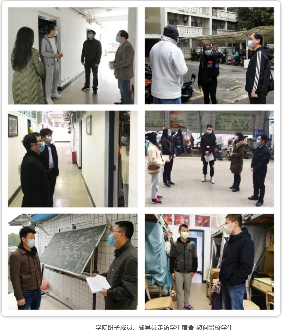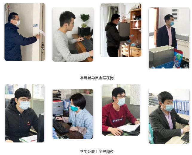 各学院党委书记、副书记等党员干部和辅导员一起,积极投身学生疫情防控一线工作,深入学生群体摸排人员情况,以高度的责任感落实防范阻击的工作责任。许多家在外地的辅导员在接到工作任务以后,第一时间返回了学校,多数人守望校园度过了一个“最团圆”的年。他们发扬政工队伍特别能吃苦、特别能战斗的优良传统,深入学生宿舍关心关爱留校学生,将各项教育管理服务工作做精做细做实,力求每个环节都能真正做到围绕学生、关照学生、服务学生。疫情面前,以细致的工作作风强信心、暖人心、聚人心,用实际行动践行党员的初心和使命。