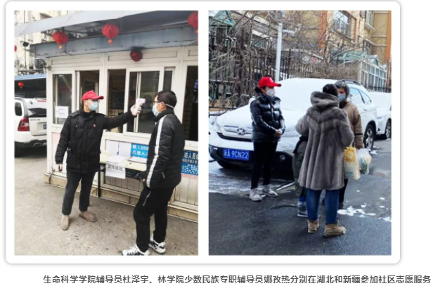 生命科学学院辅导员杜泽宇在疫情发生时正身处湖北老家。在其离校返乡后,作为医生的母亲已经结束休假提前返回战“疫”一线,母子两人没有过多的相聚,便各自投入工作,履行自己神圣的岗位职责。他觉得,在这场战“疫”中,或许自己没有母亲作为医生那样繁重的任务,但责任一样重大!除了落实所带每个学生身体状况和动向轨迹以外,杜泽宇老师重点关注湖北武汉籍同学的情况,通过电话反复提醒提高自我防护意识,安抚和疏导学生情绪,树立战“疫”必胜的信心和决心。在接到社区志愿者招募令之后,杜泽宇毅然前往社区报到,成为一名街道防疫志愿者,量体温、作登记、勤宣传、阻串门,全力支持开展社区防疫工作。
