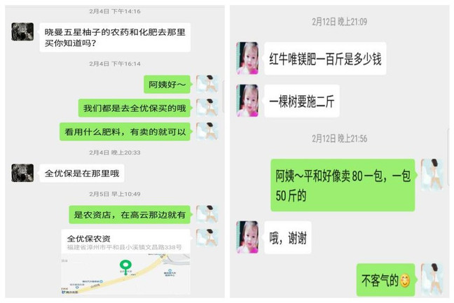 由我校吴良泉副教授团队成员组成的“平和琯溪蜜柚科技小院”师生充分利用信息化工具和手段为平和县柚农提供在线咨询服务与技术指导。一是通过一对一答疑解惑,在线细心指导平和县柚农开展春季施肥管理。根据不同农户不同土壤肥力特点,如何匹配肥料品种、施肥量、施肥位置以及施肥方式等方面进行详细答疑解惑,已在线指导平和县坂仔镇林新民、山格镇吴建和、文峰镇徐文水等众多蜜柚种植大户开展春季施肥管理工作。二是传播绿色高效种植技术、免费提供专业咨询服务。利用微信公众号、微信聊天、短视频等信息传递渠道传播普及绿色高效施肥及植保等技术和相关知识,向求教生产问题的柚农们提供专业咨询服务,帮助农户们解决当前蜜柚种植管理上遇到的问题;通过远程指导柚农开展示范基地施肥工作,提升柚农科学高效施肥本领。此外,吴良泉副教授团队还通过微信聊天、电话沟通等方式了解目前平和蜜柚产区农药化肥等农资产品的储备以及供应情况,在当前防疫情的特殊时期,为农资企业和柚农提供满足蜜柚生长发育需求的可替代农资方案;运用相关的研究成果和科技知识为企业和科普推广站提供技术材料,为其开展在线科普培训活动提供技术支撑。