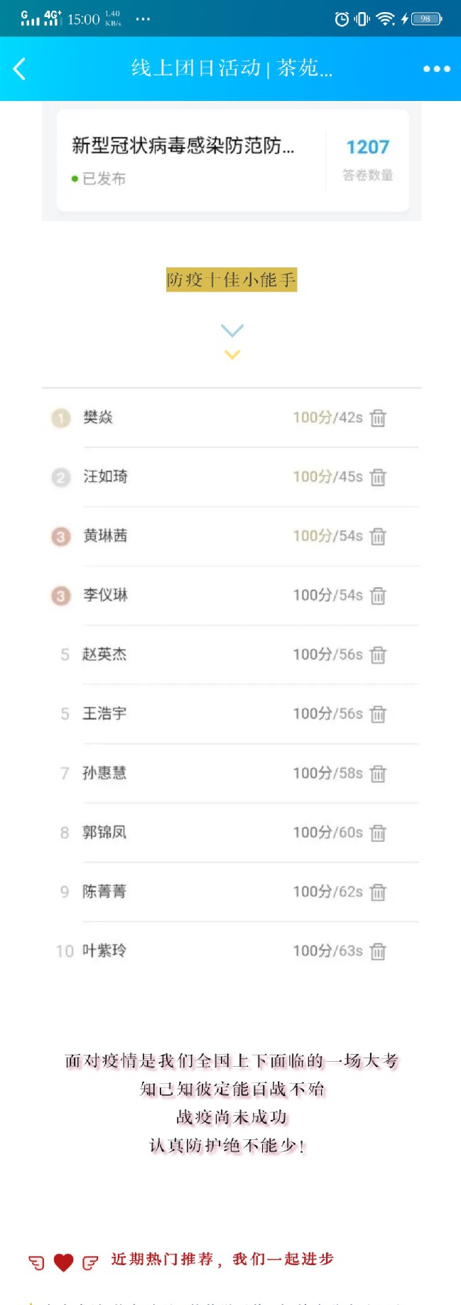 每项团日活动都以线上的形式进行,同学们积极参与,活动覆盖面广,其中线上问答活动参与度达1207次。疫情面前,学院学子发挥青年主力军的作用,积极肩负时代赋予的使命与责任,与各行各业的“战士”一起为抗击疫情贡献自己的一份光和热。
