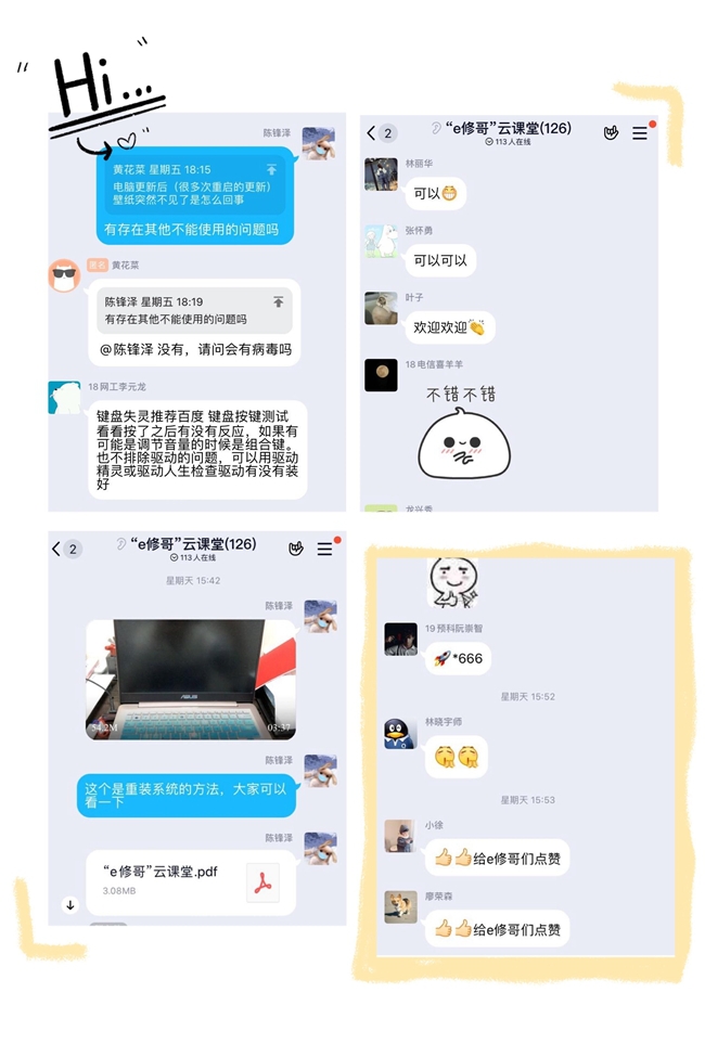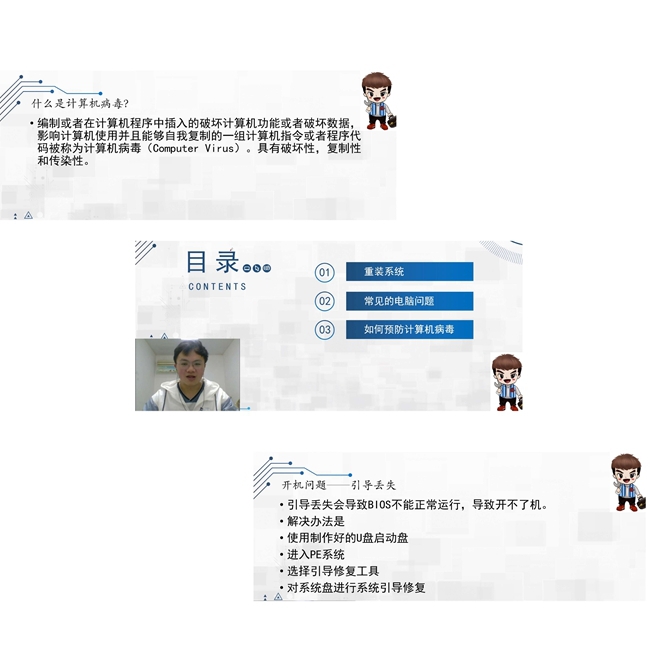 本次“e修哥云课堂”直播围绕计算机常见故障以及维修方法、计算机病毒的分类以及预防、开机重建系统的引导、网络崩溃及解决方法等四个方面知识点进行授课,志愿者解说语言流畅、动态演示清晰明了,云课堂的另一端不时传来同学们的热情的回应。此次直播共吸引120多名学生,大家充分肯定此次网络志愿服务行动,表示直播能更好学习计算机相关知识,更易掌握解决技巧。
