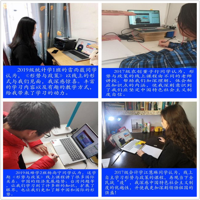 学生们纷纷表示,用问题引发我们思考,极大地激发了我们上课的积极性和主动性。通过线上课程,对确保如期打赢脱贫攻坚战、坚决打赢新型冠状病毒感染肺炎疫情防控阻击战、中国的经济发展趋势等问题有了深刻认识。