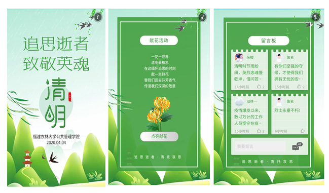 公共管理学院团委搭建了线上“追思逝者,致敬英雄”平台,同学们通过登陆该平台,以阅读革命英烈们的先进事迹等方式进行线上活动。随后同学们以网络献花这一绿色环保的形式,缅怀英烈的丰功伟绩,表达对抗疫牺牲者和革命先烈的敬仰和追思。