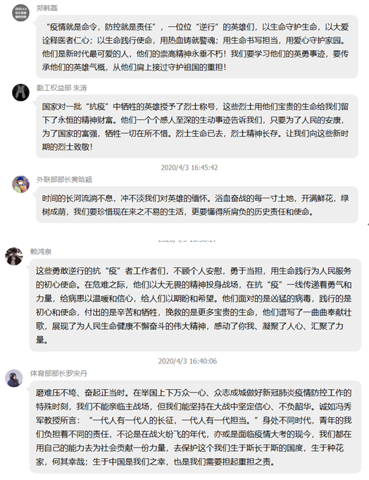 学院辅导员和学生干部们也在平台上留下自己的感悟并进行深入讨论。他们表示,作为当代大学生,要铭记英雄事迹、传承烈士精神,牢记职责与使命,弘扬英烈们甘于奉献、不怕牺牲的精神,以良好的精神状态投身学习和工作中,继续为抗击疫情和祖国发展贡献青春力量,踏着英雄的足迹继续前行。