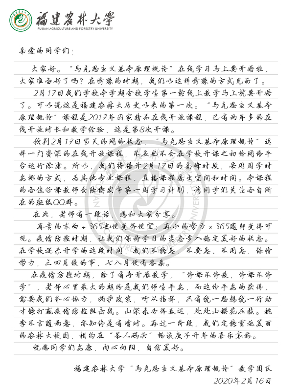 在开课前一天,“马克思主义基本原理概论”课程团队致同学们一封信,鼓励同学在学校还未开学的这段时间,不能急,不要急,不用急,以保持学习的姿态步入稳定美好的状态,并警醒大家,疫情防控的胜利需要大家齐心协力,拥护政策,听从指挥,统一思想统一行动。“见字如面”,以书信的形式做好开学第一课,充分发挥思政课在凝聚学生共识、坚定信心、统一行动方面的重要作用。
