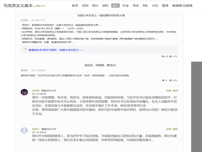 3月9日教研室组织教师们与全校学生同上一堂“疫情防控思政大课”,通过QQ群、学习通等平台进行师生在线交流,将思想政治理论课的教学优势转化为支持防疫斗争的强大力量,引导学生增强“四个意识”、坚定“四个自信”、做到“两个维护”。林贤明、谭文华等老师及时引导学生结合自己的学习、生活以及在本次抗击疫情中的做法畅谈了自己的想法、思考。李星老师、裴文庆老师引导学生围绕思政大课情况撰写心得体会。
