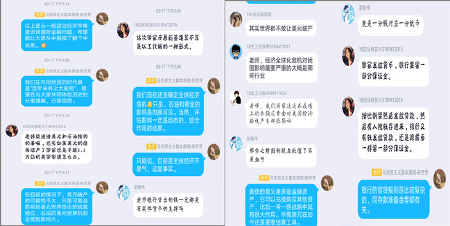 陈芳芳老师在马克思主义政治经济学的教学中,结合美股暴跌和多次熔断的现实,引导学生思考资本主义金融市场运作模式,2020年的疫情对全球经济的冲击等问题,利用在线教学的互动功能,展开讨论,并让学生深入了解即便疫情影响,我国经济长期向好基本没变化。