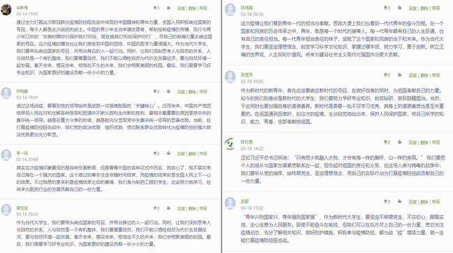 3月20日教研室通过学习通和爱课程平台发布《习近平总书记给北京大学援鄂医疗队全体“90后”党员的回信》,组织学生学习回信精神,思考如何努力学习增长本领,勇挑重担,让青春在为人民服务中绽放绚丽之花。温福英老师组织学生阅读回信精神,开展“读回信,树理想,挑重担!”的学习讨论交流活动。